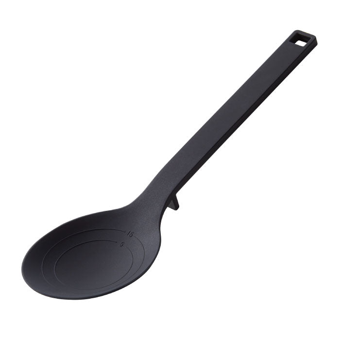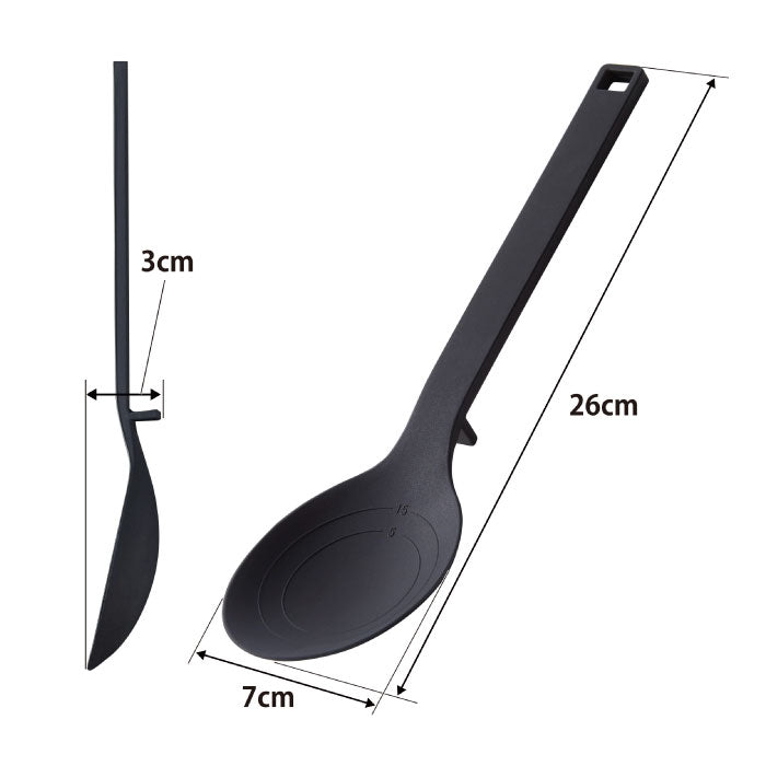 5cc(小さじ)・15cc(大さじ)が計れるメモリ付き。シリコーン製で滑りにくく、フライパン・ナベなどを傷つけません。スープがすくえる深めのスプーン形状。(約30cc)取り分け・盛り付けに便利。